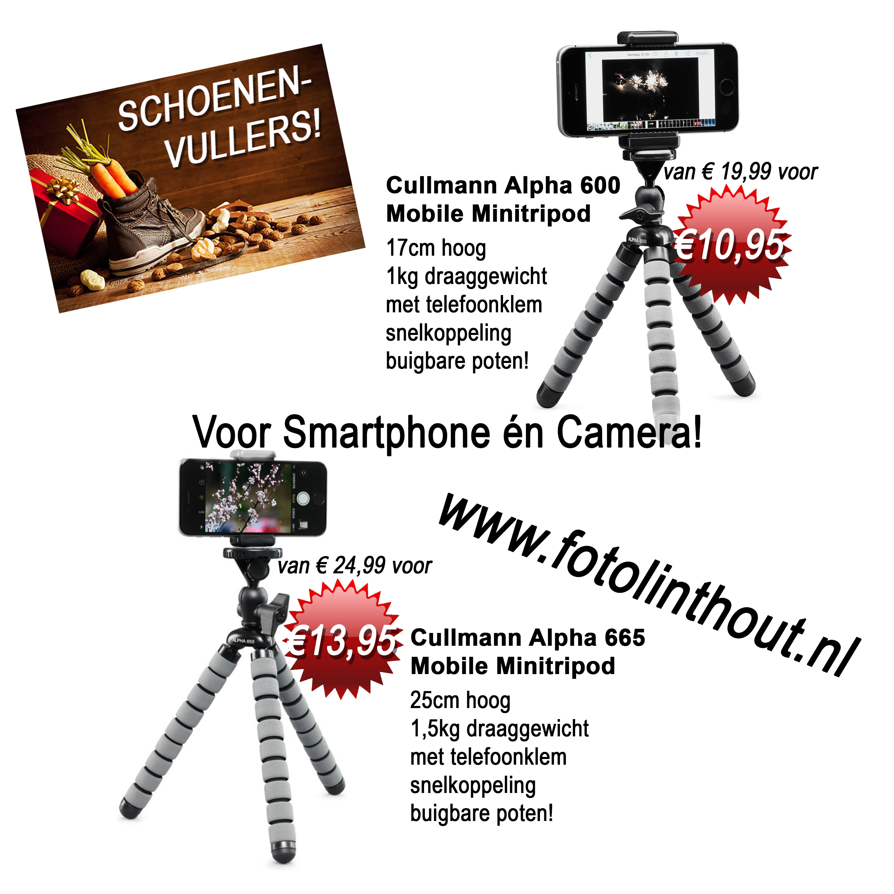 Leuk om te geven, leuk om te krijgen, en héél voordelig nu: Cullmann Alpha Mobile Minitripods. In twee maten, met handige buigbare poten, bruikbaar voor zowel smartphones als camera’s!