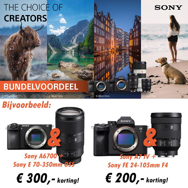 Vanaf 1 april 2026 voert Sony weer de Choice of Creators bundels met extra voordeel! Voor deze actie zet Sony een aantal combinaties van haar mooiste cameramodellen en lenzen in de spotlight en geeft bij aankoop van deze bundel een dikke korting die kan oplopen tot € 300,-!